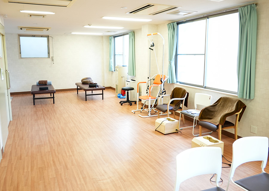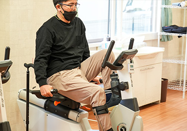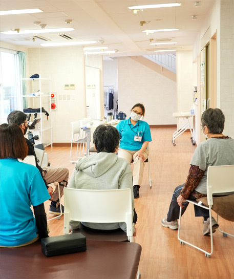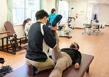 リハビリの専門家である理学療法士が、理学療法を用いて病気、けが、高齢、障害などによって運動機能が低下した状態にある利用者様に対し、日常生活を行う上で基本となる動作の回復や悪化予防を目的にリハビリを行います。